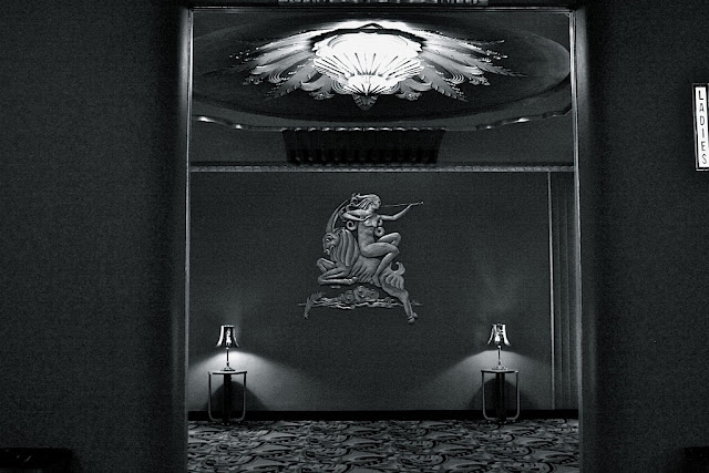Here's another detail from that deco palace, the Paramount Theater.  I like these shots in black and white.  Somehow, they seem to fit the era better.  The nymph on the ram is in silver foil.  The ceiling light is frosted glass that gives it that Lalique look.  For more black and white photos, visit The Weekend in Black and White.