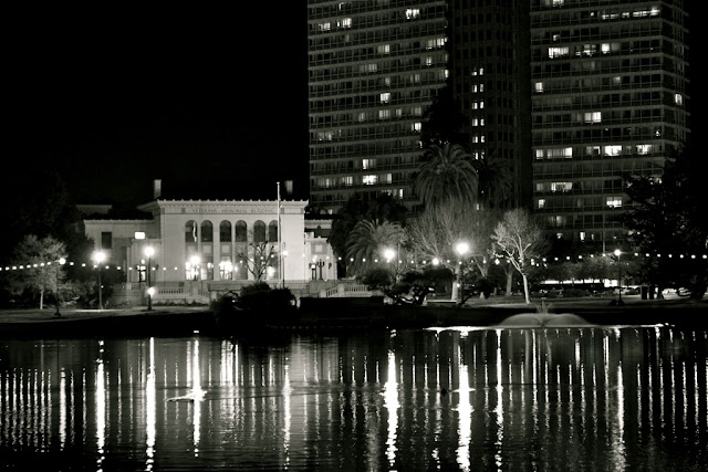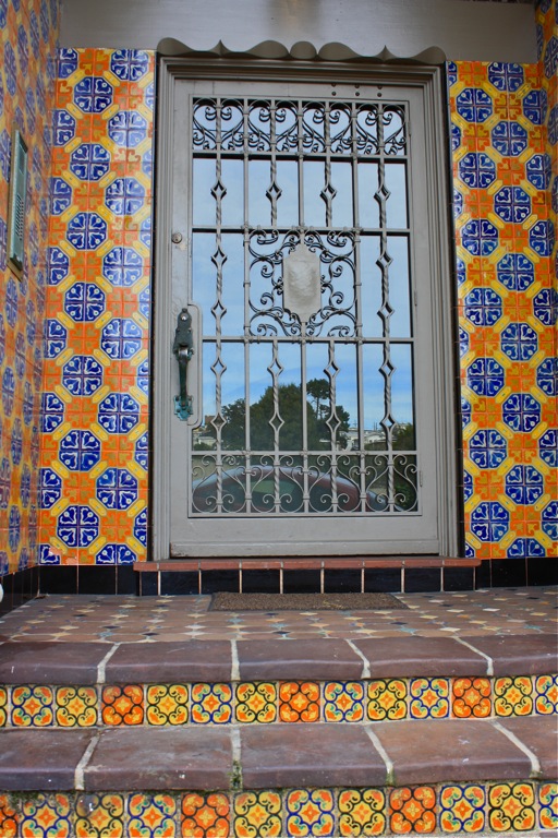 A wonderful old apartment building in East Oakland. The entry of this building is decorated with vintage California tiles, many of which were manufactured in the Bay Area, This building is located at about 7th Ave., E. 24th St. and Ivy. The reflection was an added bonus. For other reflective photos, visit