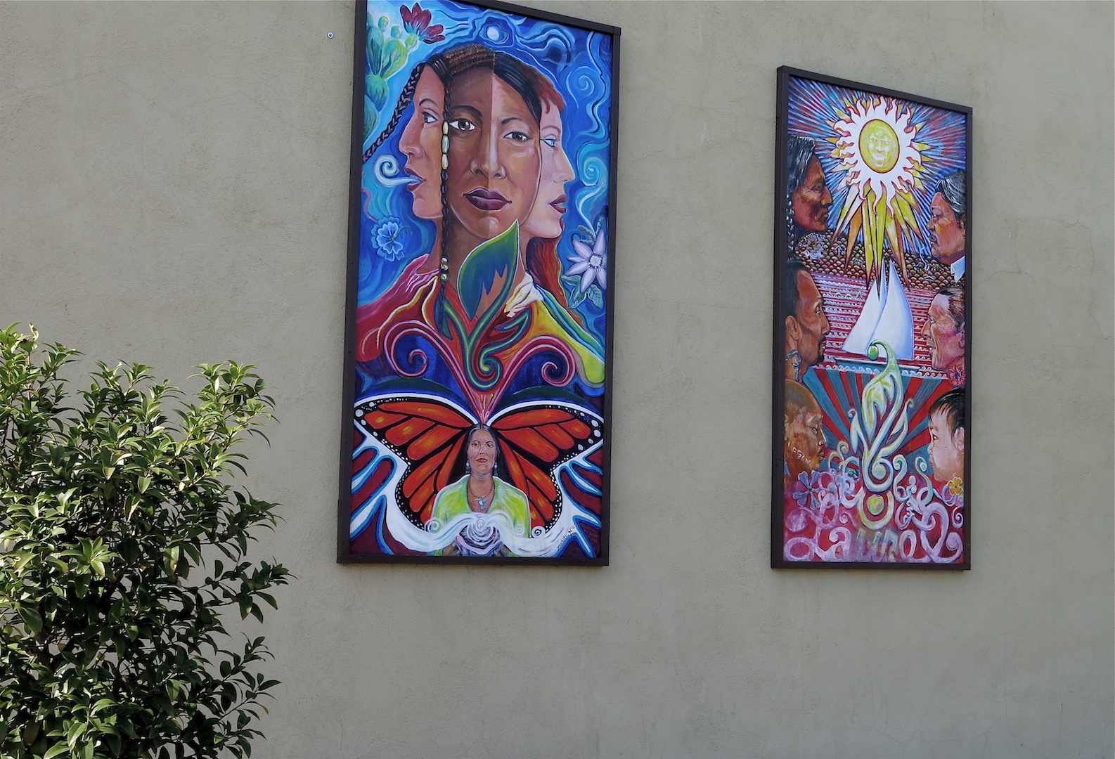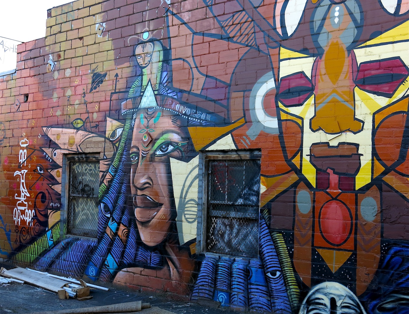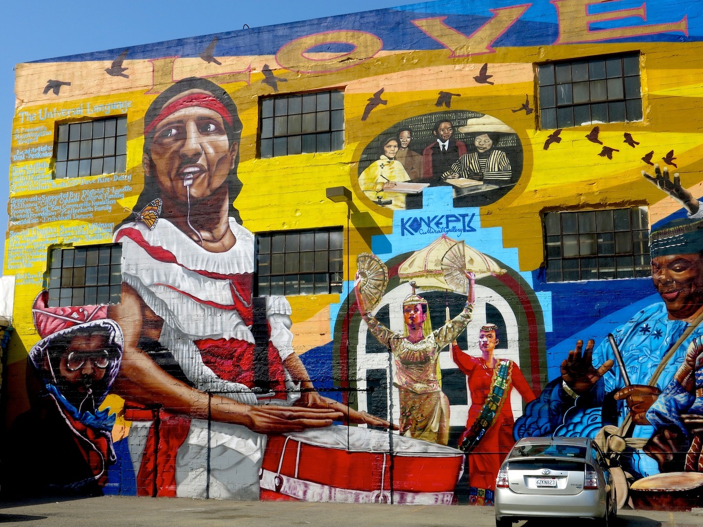 Dan Isaac Bortz, has works around the world and works in multiple media. As we see in this piece, his art includes mystical symbols, mythology, and spiritual themes. Found on San Pablo Avenue among many small murals done by other artists.