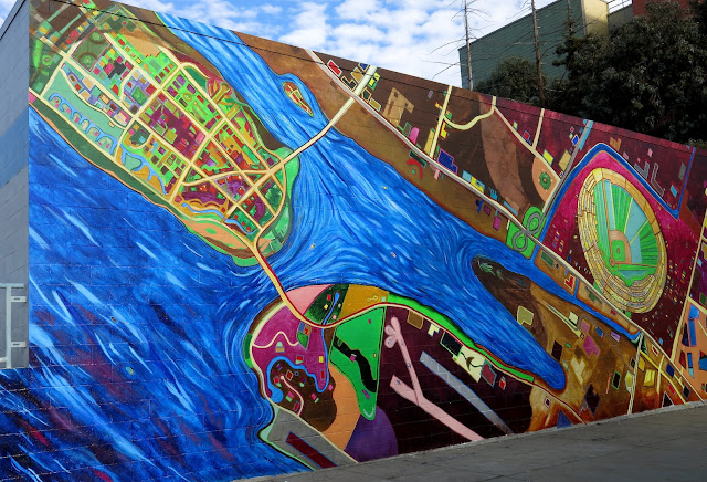 It took me a while to grok this image and then it came to me. It's an aerial view of the eastern estuary! The circle in the upper right corner is the A's ballpark minus the Oracle arena next door. The upper left represents the island city of Alameda. The peninsula in the lower portion is the airport. All the bright yellow lines represent the freeway, bridges, and main streets in the area. The blue water is the estuary which runs in from the Bay. The mural, done this year by Alan Leon, is formally named Fields of Dreams: the fabric of the city. His work graces the freeway support piers in the Temescal District and was featured here.