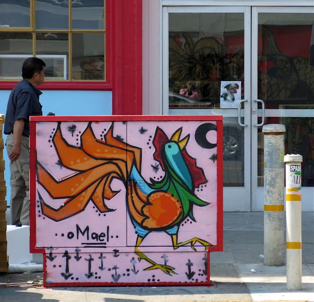 Happy Lunar New Year, you all. I found this auspicious mural by Omael Macasa on a Chinatown utility box. He's done a number of murals in Oakland; this one is in association with Dragon School. I think the rooster is crowing "Gung Hay Fat Choy" or 新年快樂.