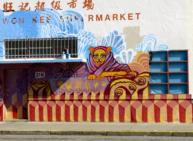 Walking about Chinatown, this mural caught my eye because it's so different. Surrounded by a multitude of dragon images, kung fu masters, and charming portraits of women, this one seems out of place. It seems gentle and sedate among the more energetic murals. Is it a guardian dog? A tiger? A zodiac symbol? I don't know; you tell me. Didn't see a signature.