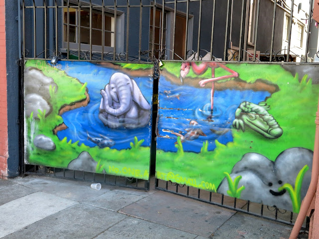 I found this while wandering around West Oakland. I don't care if the rock has a smiley face on it. The side glance on the flamingo and the presence of the gator tell me "keep out." Of course the chain and padlock make the definitive statement.