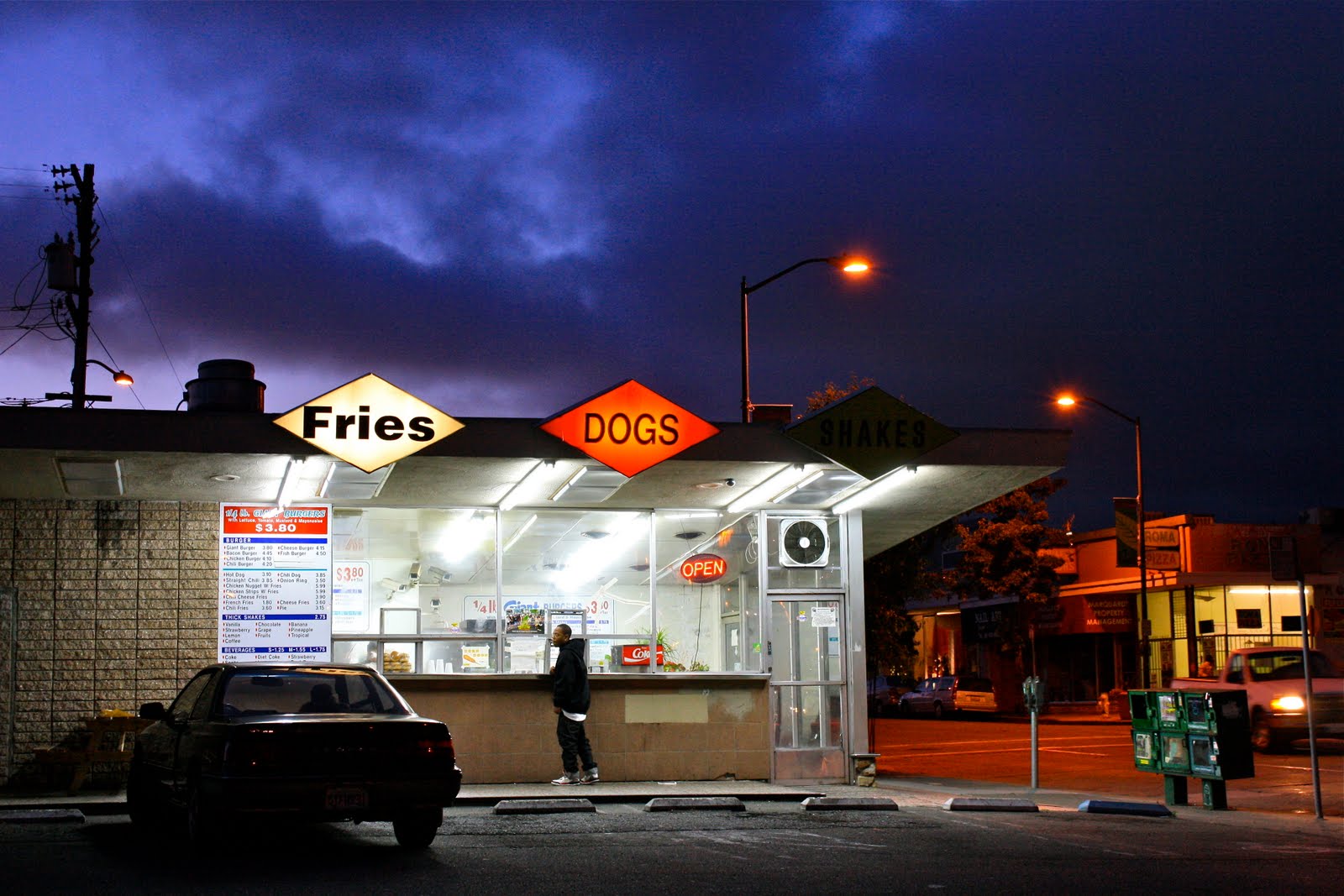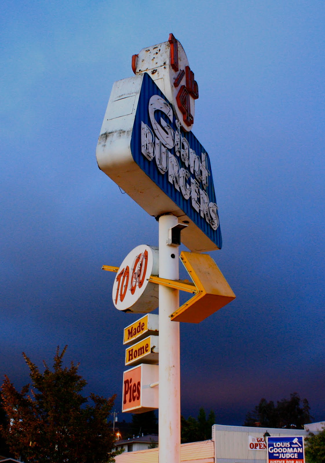 This is the 1/4 Lb. Giant Burger at High Street and MacArthur in the Laurel District.  The diamond at the far right should read "Shakes" but the light is burned out.