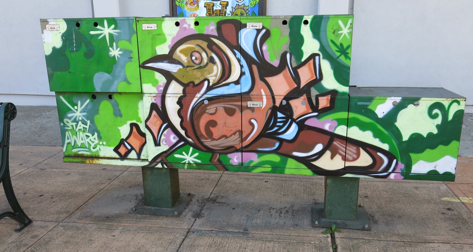 This small mural is painted on the back of a magazine rack for multiple newspapers.  Interestingly, the rack is no longer in use and the other side looks very shabby.  Seems like the rack should be removed; but in the meantime this image adds some sparkle to the streetscape.  Couldn't find a signature on this piece.